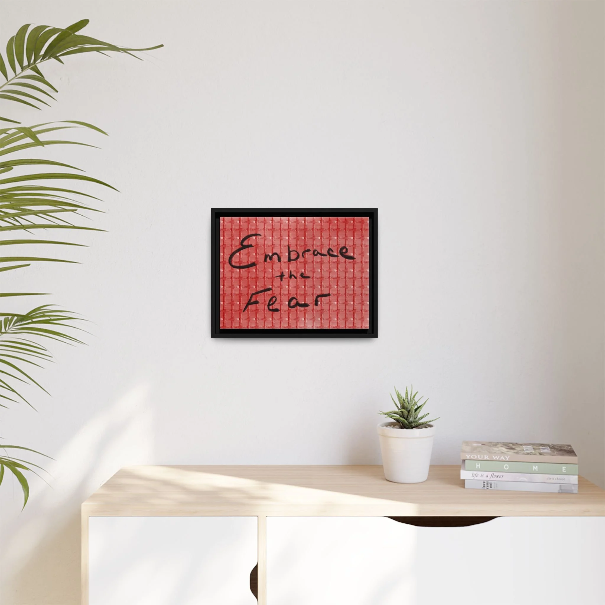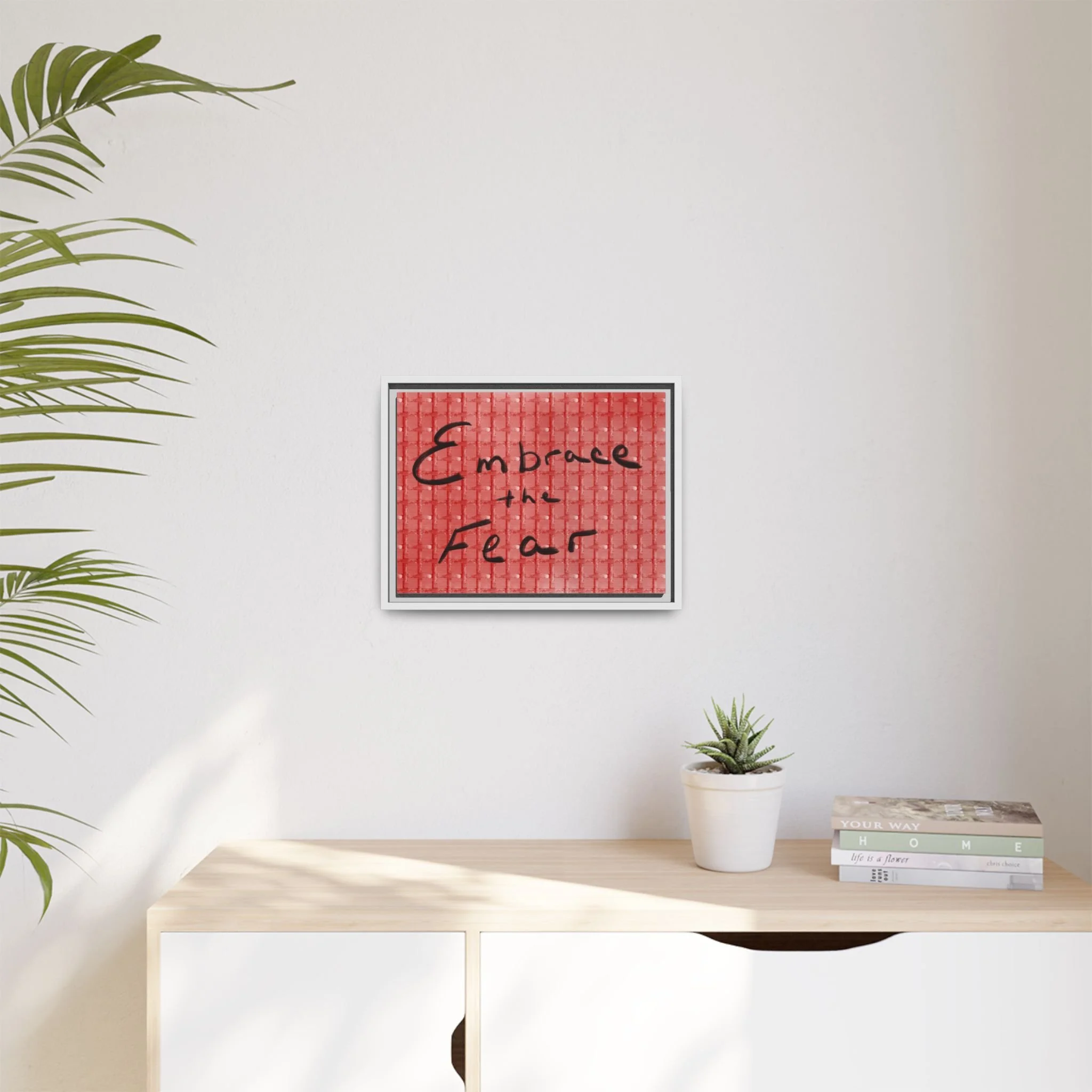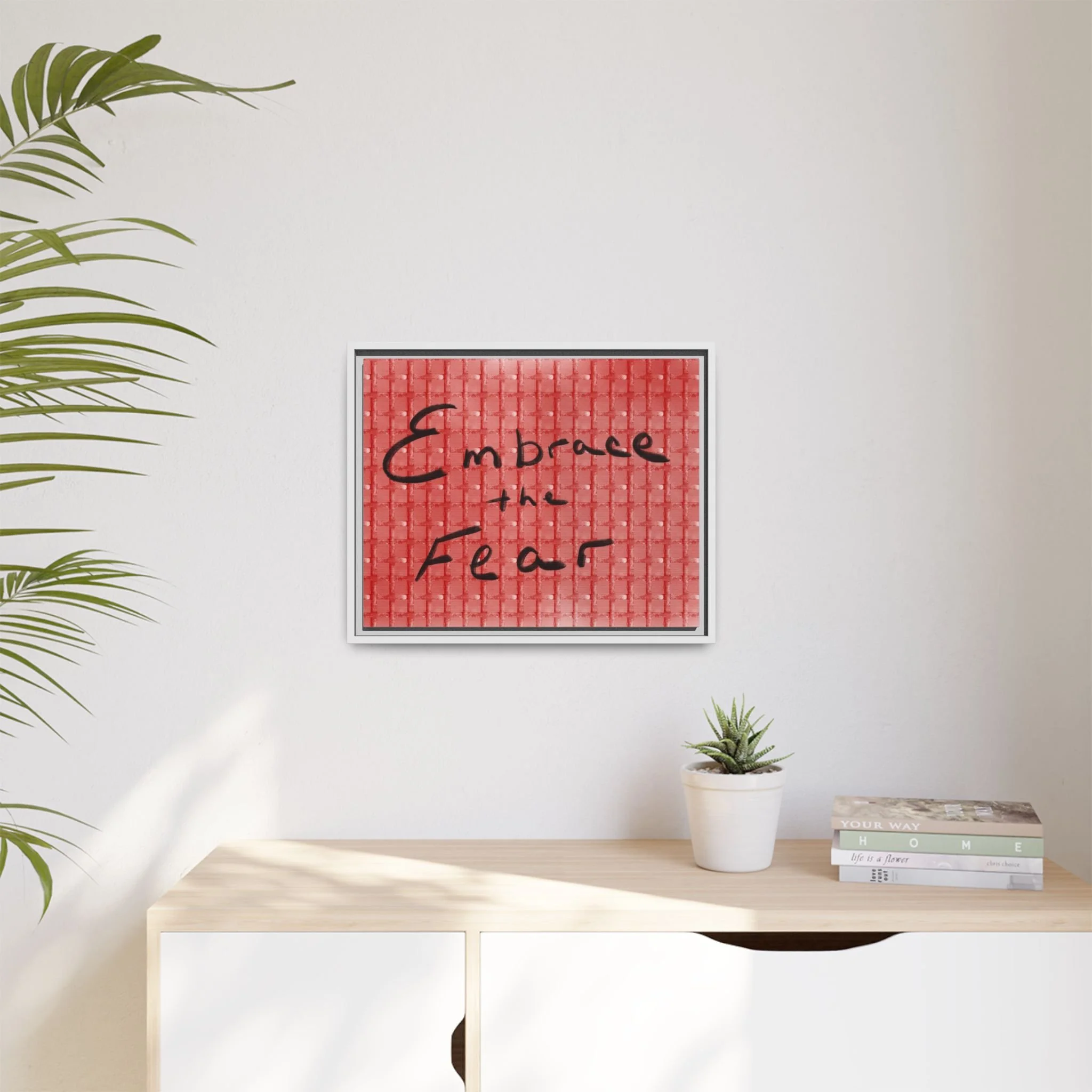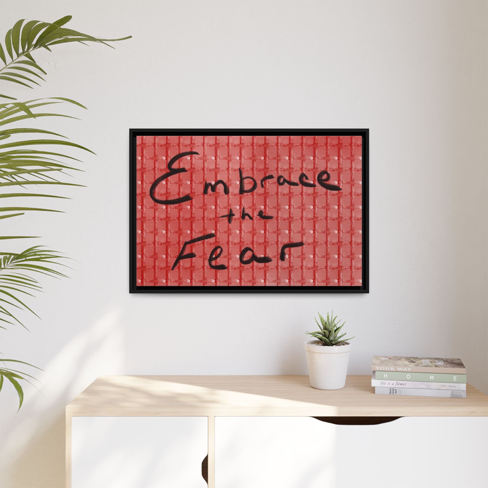Turn courage into daily inspiration with this bold digital print. Featuring the phrase “Embrace the Fear” in flowing black handwriting against a red background, this artwork serves as a reminder to face challenges, step out of comfort zones, and grow stronger through adversity.